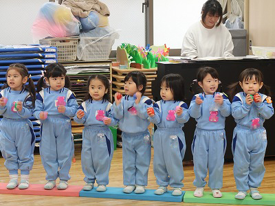 タマゴのマラカスを持って「おもちゃのチャチャチャ」をしたよ。