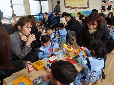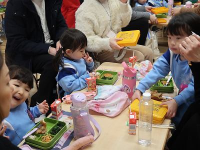 お家の人と一緒に幼稚園で給食。うれしいね。