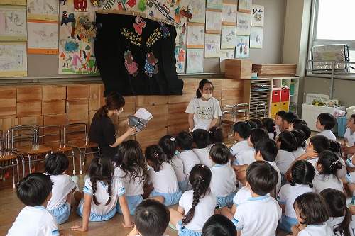 こちらは七夕の紙芝居を見ています。織姫様と彦星様だよ。