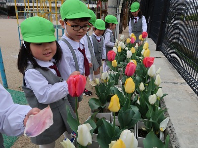 冬に植えたチューリップが咲いていました。きれいだね。