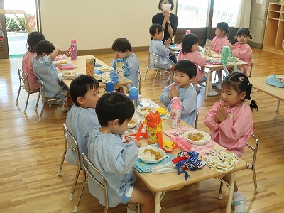 今日はカレー給食。めばえ組さんは、初めての給食です。