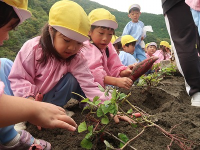 おいもさんが見えてきたよ。がんばって掘ろうね。