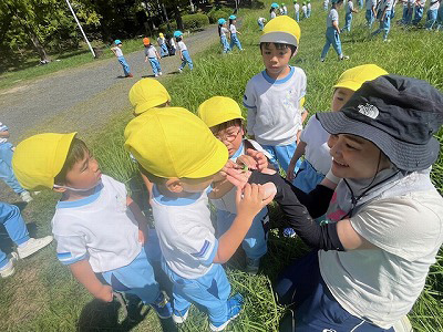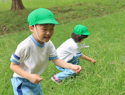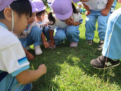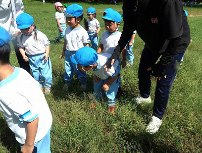 そーっとバッタを捕まえに行く年少さん。大丈夫?