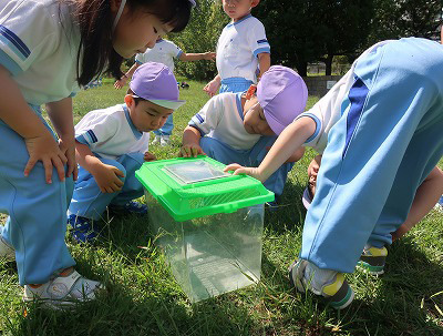 バッタを幼稚園に連れて帰ろうね。新しいお友だちです。