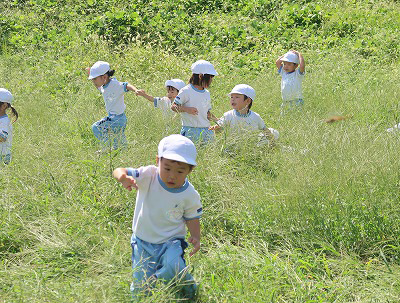 どんどん追いかける子どもたち。バッタさん、待て待てー!