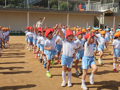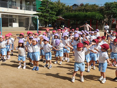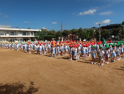 青空の下、全園児が運動場に並んで、園歌を歌いましたよ。