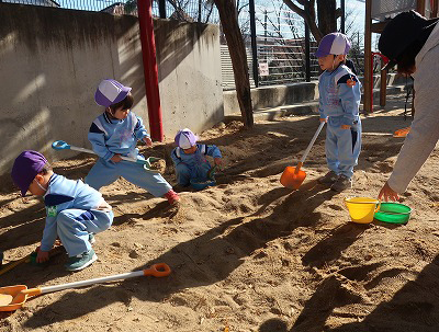 終業式の後に、満3歳さんは砂場で遊んだよ。