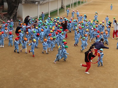 運動場に鬼が襲来!子どもたちが駆け出してきました。