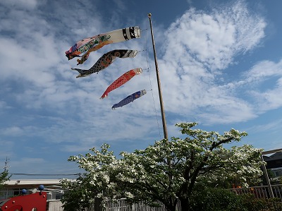 春のあたたかな良い日、こいのぼりが泳いでいます。